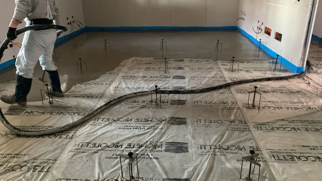 Realizzazione di sottofondo alleggerito a copertura impianti e massetto autolivellante su isolante termico